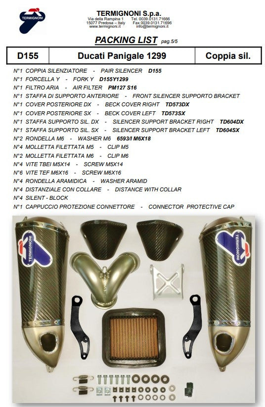 El Kit de Slip-On de Carbono Termignoni para la Ducati Panigale 959 (2016-2019) ha sido diseñado específicamente para uso en pista, con el fin de optimizar la potencia y mejorar la dinamismo de conducción. El kit consta de dos silenciadores ligeros de Carbono/Titanio (D155102CPT) y un tubo de conexión (D155Y2), que proporciona una salida de gases optimizada. Este Kit de Slip-On no está homologado para uso en carretera, sino que está diseñado exclusivamente para competición.